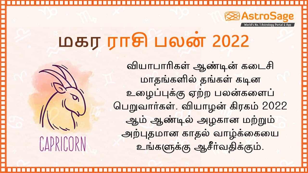 மகர ராசி பலன் 2022 Capricorn Horoscope 2022 in Tamil . Read Magaram Rasi palan 2025 (Capricorn horoscope 2025 in Tamil) with accurate predictions from our expert astrologers of AstroVed.com. Capricorn Monthly Horoscope Video for October 2025